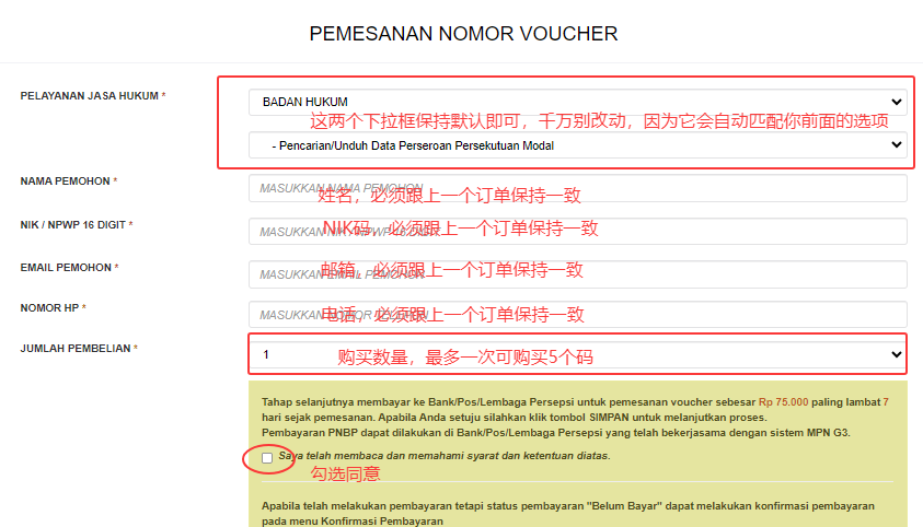请注意,前面的两个下拉框保持默认即可,不用另外勾选,否则会跟前面信息有冲突。后面就是常规的姓名、NIK身份识别号、邮箱、电话以及购买的数量,切记要跟前面第一个订单保持一致。