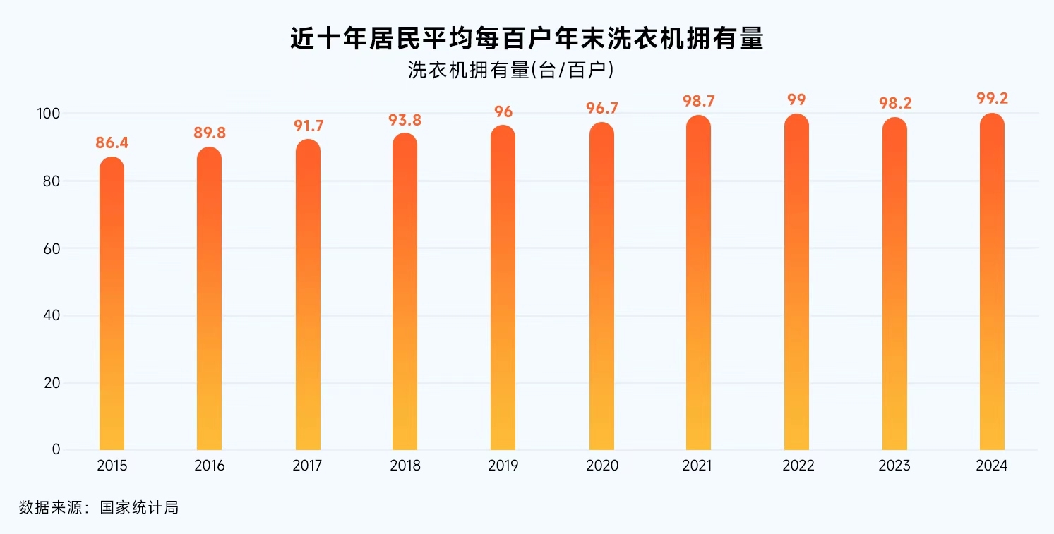 作为曾经的“四大件”之一,洗衣机早早就进入了中国市场。国家统计局数据显示,截至2024年全国居民平均每百户洗衣机拥有量达99.2台。存量市场下,为撬动“以旧换新”消费需求,厂商们不断堆砌产品卖点,洗衣机功能越来越花里胡哨,但也只能短暂吸引注意力,用户很难“长情”。核心在于,这些创新已经脱离了“洗干净”的本质,在消费回归理性的当下,消费者已经不愿意被冗余功能裹挟了。