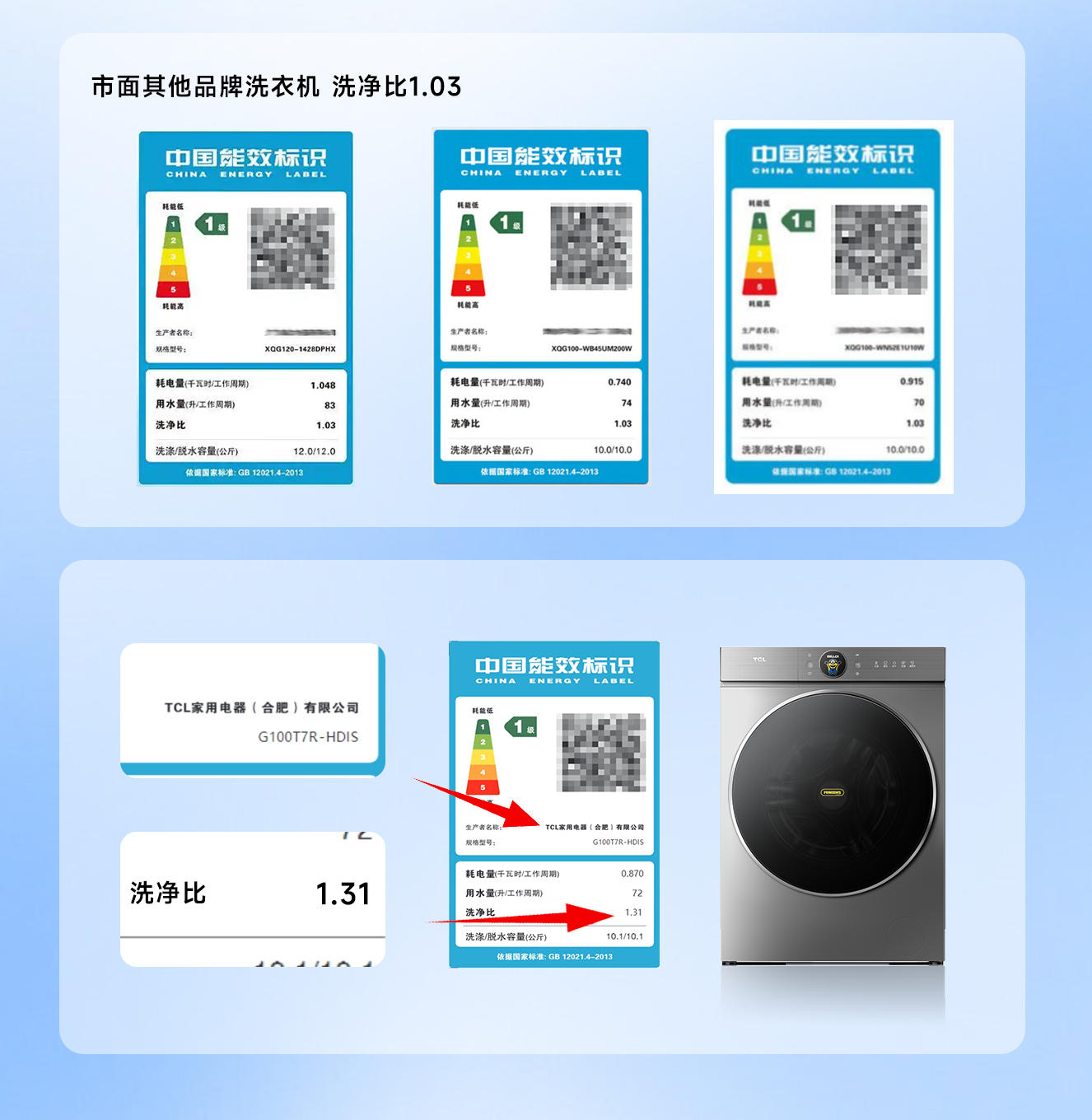 可以理解为行业有一个基准分值,用其他洗衣机的得分去除以它,数字比1大就是比它好。目前主流产品基本都是1-1.08之间,少数产品能做到1.1以上。而新一代的TCL AI超级筒,已经把这个数值做到了1.31。换句话说,就是100分标准的卷子,TCL洗衣机交出了131分的超高分答卷,实现了行业的绝对领先。