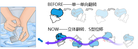“搓”的目的,是搞定一些特别难洗的区域,比如领口、袖口这些,搓得越细洗得越干净。背后的原理,其实是通过摩擦力来实现污渍与衣物的剥离。我们看洗衣机中会有几根条状的凸起部分,学名叫提升筋,就是为了让衣物翻转起来,提升摩擦力。TCL AI超级筒从大自然中汲取灵感,做了“一长一短”交错布局的6根鲨鱼鳍状仿生提升筋,让衣服能在洗涤过程中实现“S”型翻转,覆盖各个方向,还原了手搓的过程,洗涤效果更出色。