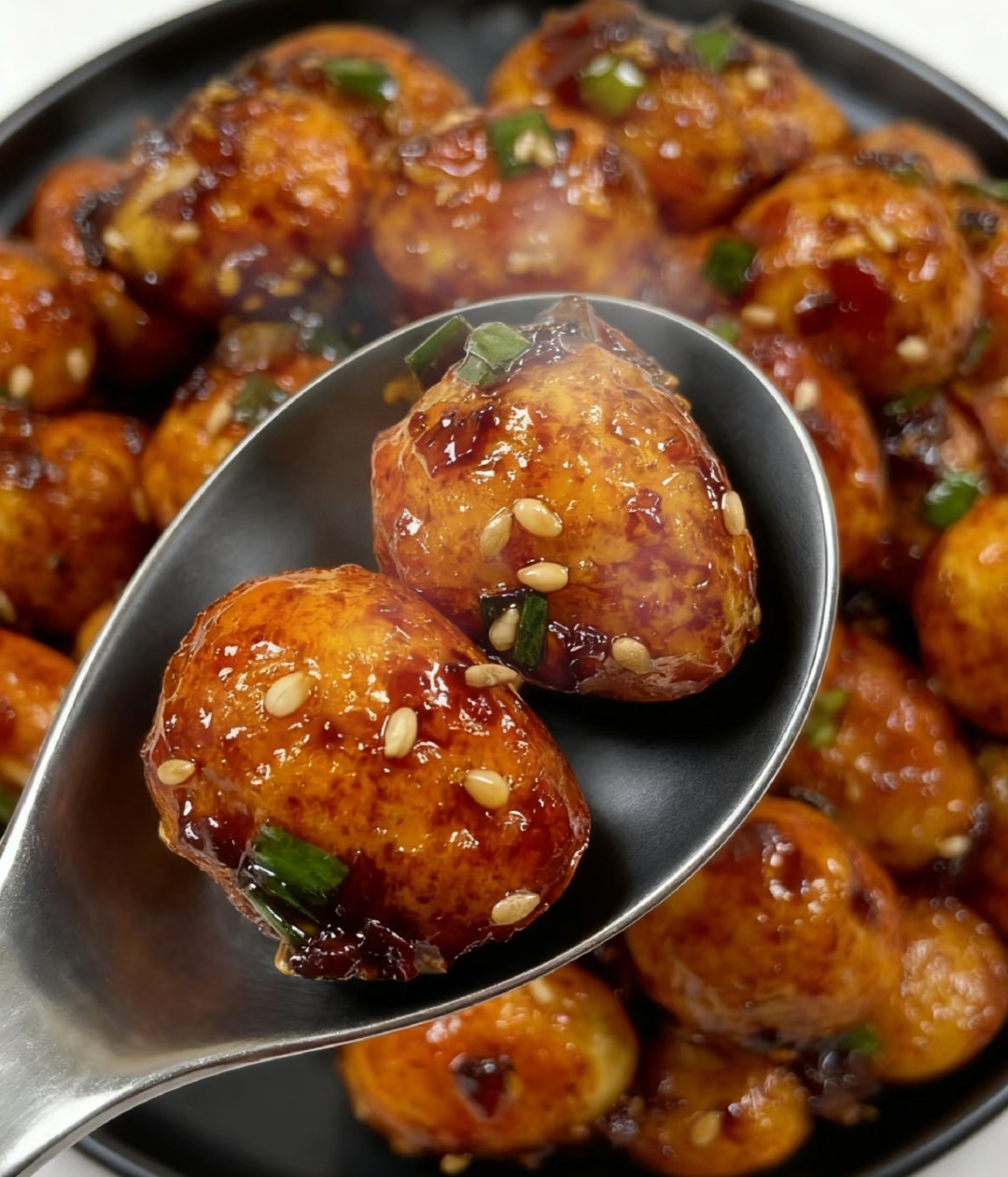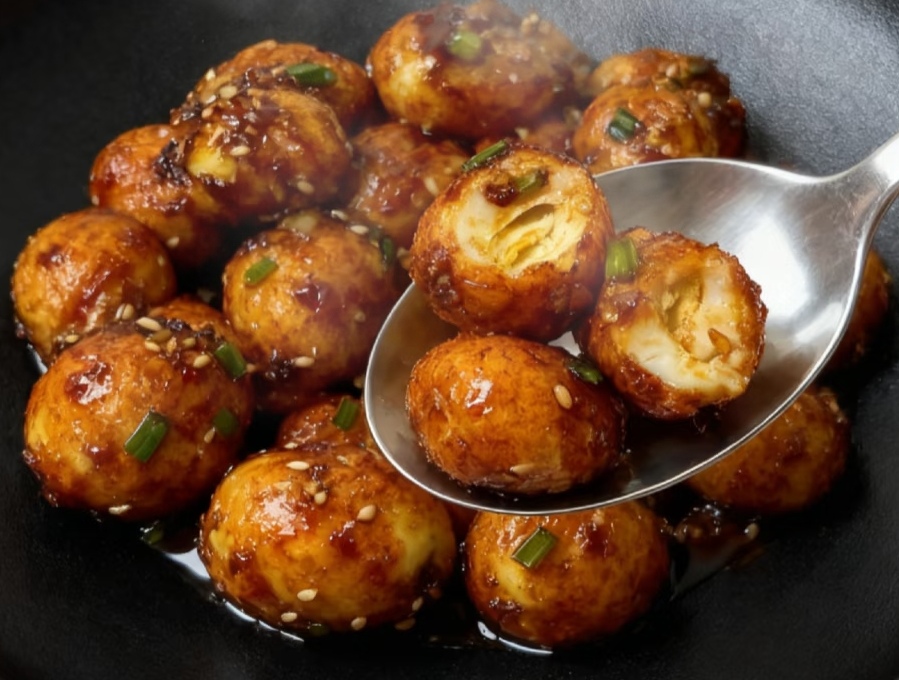 5. 收汁:中火让蛋在酱汁里打滚1分钟,汤汁变稠挂壁,关火。