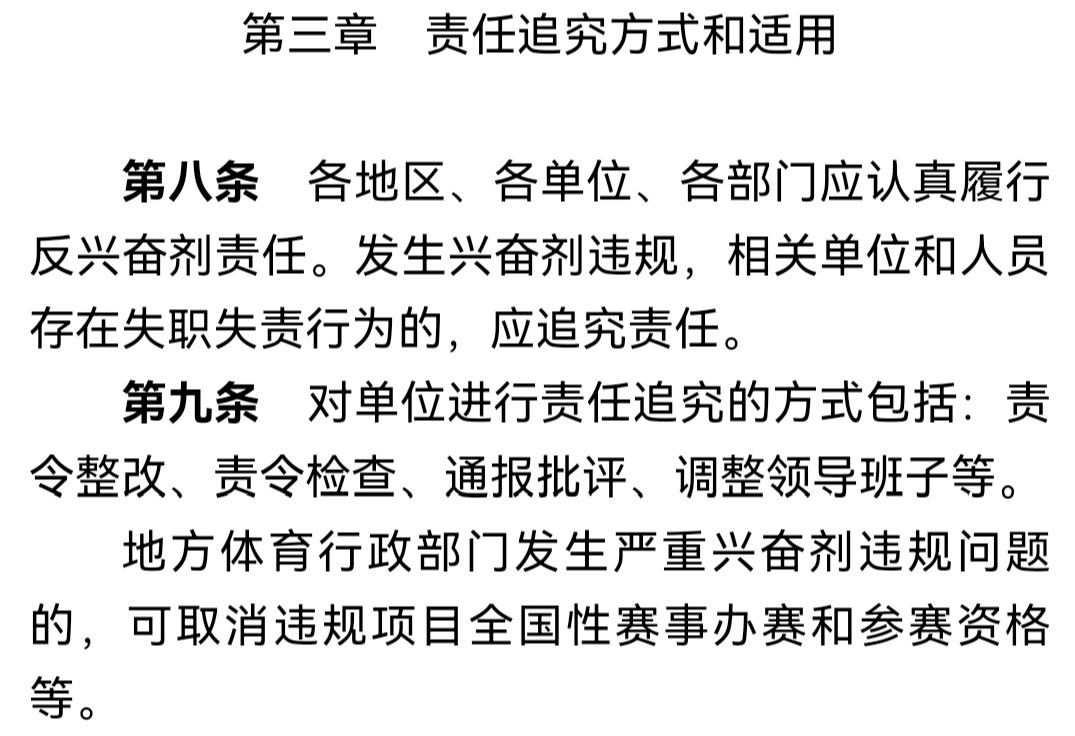 另外,早在2021年国家就对“反兴奋剂”做出相关规定,在第三章第八条就规定“发生兴奋剂违规,相关单位和人员存在失职的,应追究责任”。第十三条,“在重大体育赛事活动期间、重要敏感期发生兴奋剂违规,造成严重后果和恶劣影响,从重处罚。”