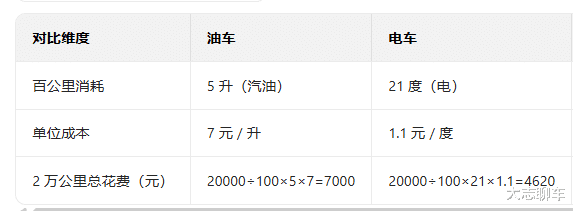 这时候,你再来计算里程数,我们按照一辆油车,百公里油耗是6个油,每个油是7块钱,而同样一辆大小的电车,百公里电耗是21度电,一度电1.1块钱,他们行驶2万公里需要花费多少钱?我给大家整理成了表格,对比一下会发现,油车和电车的用车成本一计算,电车只是比油车少花了2380元,也就是说,剔除掉保险后,优势并不明显。