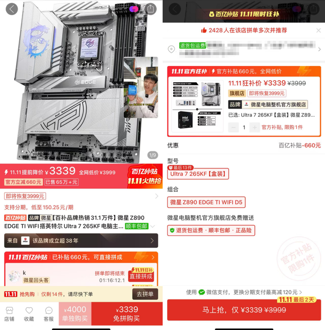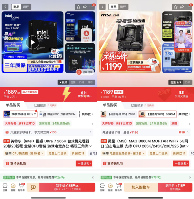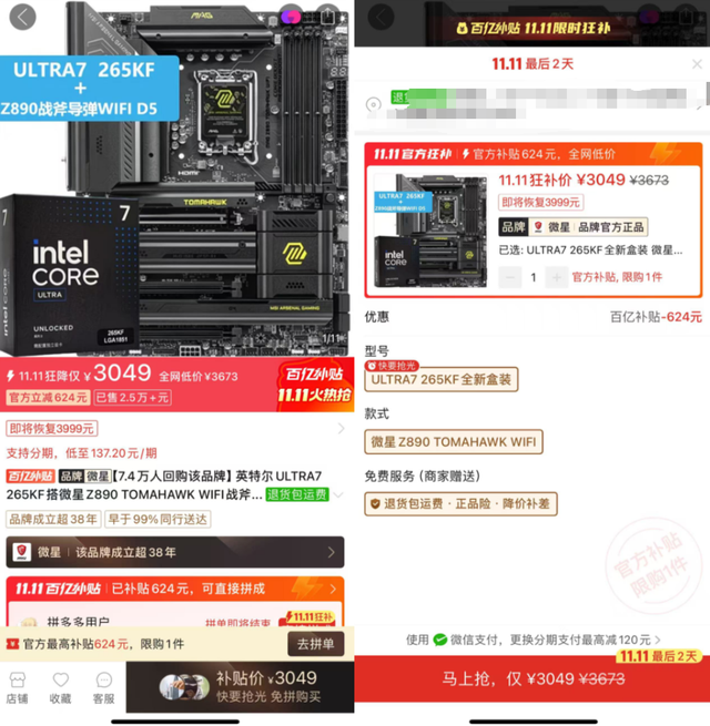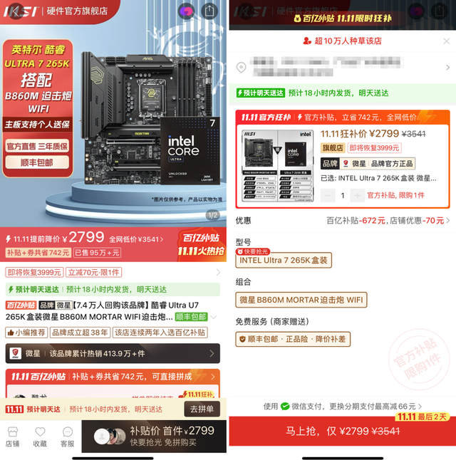 以热门套装为例,英特尔酷睿Ultra 7 265K搭配微星 MAG B860M MORTAR WIFI 迫击炮,PDD旗舰店无需复杂领券,实付到手价2799元。