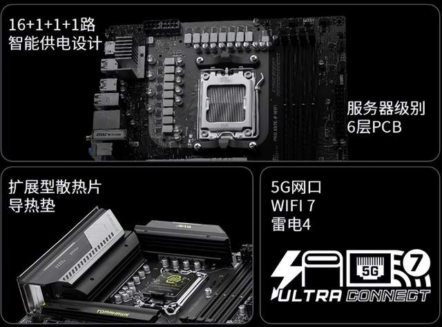 采用16+1+1+1相智能供电系统,搭配双8Pin CPU接口与强化散热装甲,为处理器超频和持久性能发挥打下坚实基础;搭载四条DDR5内存插槽,最高支持超频至9200+ MT/s。