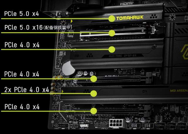 提供五个M.2插槽,最上方为直连CPU的PCIe 5.0 x4满速通道,其余四条则由芯片组提供的PCIe 4.0 x4通道,均采用第二代免工具安装设计,配合磁吸式冰霜铠甲,非常省心。