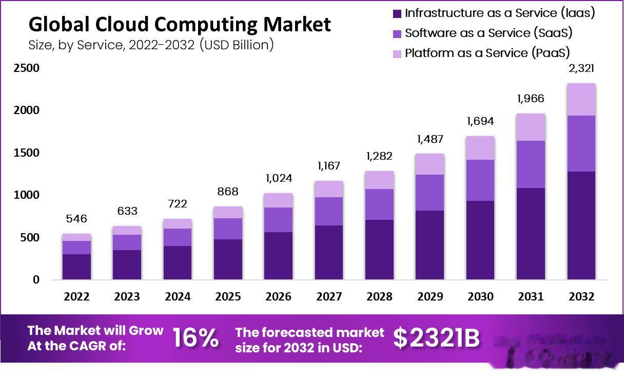 云计算市场增长曲线清晰显示了其20年来的指数级扩张。2025年全球市场规模已达数千亿美元,预计未来几年将继续以高双位数速度增长。