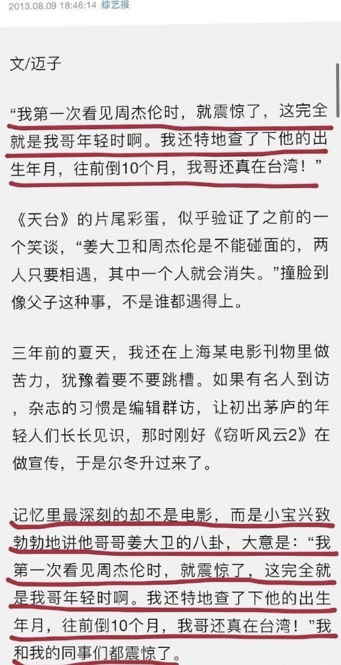 2010年尔冬升给电影《窃听风云2》做宣传时谈了他第一次见到周杰伦时的感受,活脱脱就是他哥年轻时的模样,把他都给震惊到了。为此他特地去查了周杰伦出生日期,又根据生日往前倒推10个月,发现那段时间姜大卫还真台湾。要不是姜大卫否认周杰伦是他儿子,尔冬升都以为自己多了个侄子。