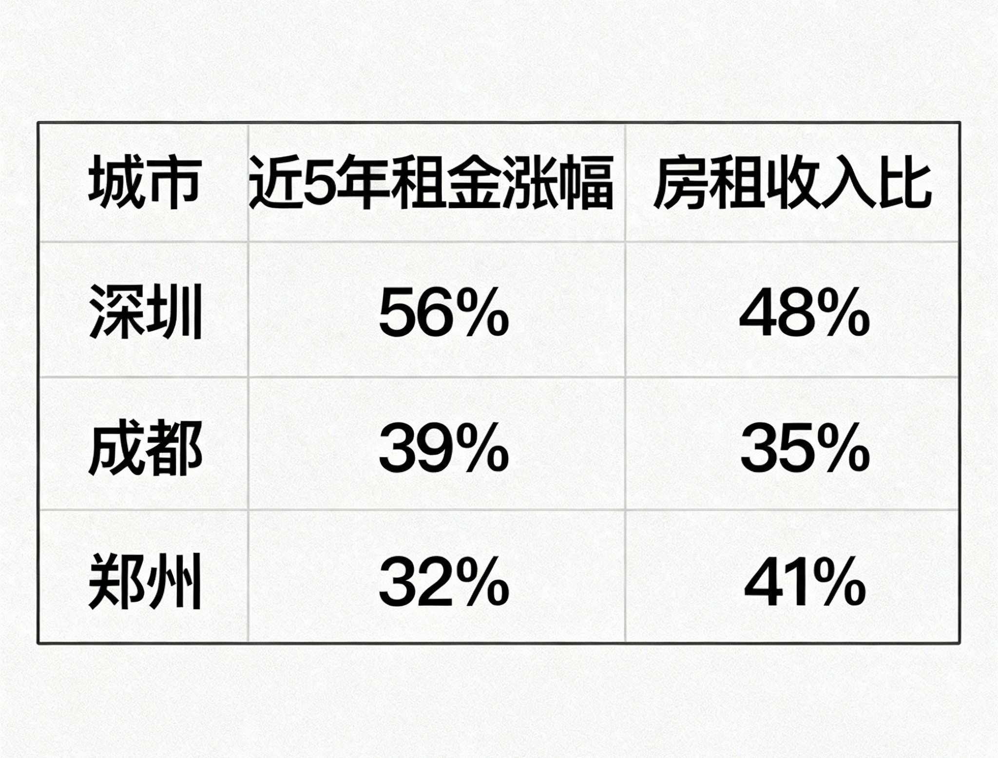 深圳、成都、郑州近5年租金涨幅、房租收入比对照表:
