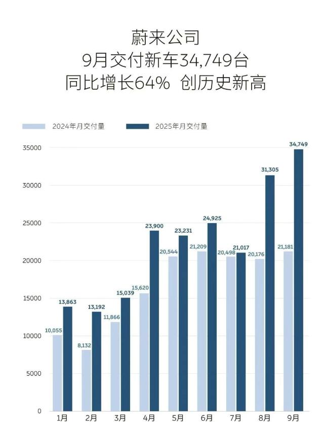 蔚来9月交付新车34749台,同比增长64%,环比增长11%。其中,蔚来品牌交付13728台,乐道品牌交付15246台,firefly萤火虫品牌交付5775台。乐道L90上市两个月累计交付21626辆,已成为蔚来公司的销量主力,显示出多品牌战略的初步成效。值得一提的是,蔚来已经连续两个月在销量上超越了理想汽车。