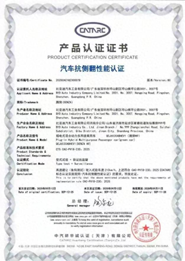 2025年9月,腾势N9以210km/h的速度成功通过鱼钩测试,实现了高速避让安全不侧翻,第三次打破了世界纪录! 这比今年4月它自己创造的180km/h纪录又提升了30km/h,远超国际标准80km/h两倍以上 。