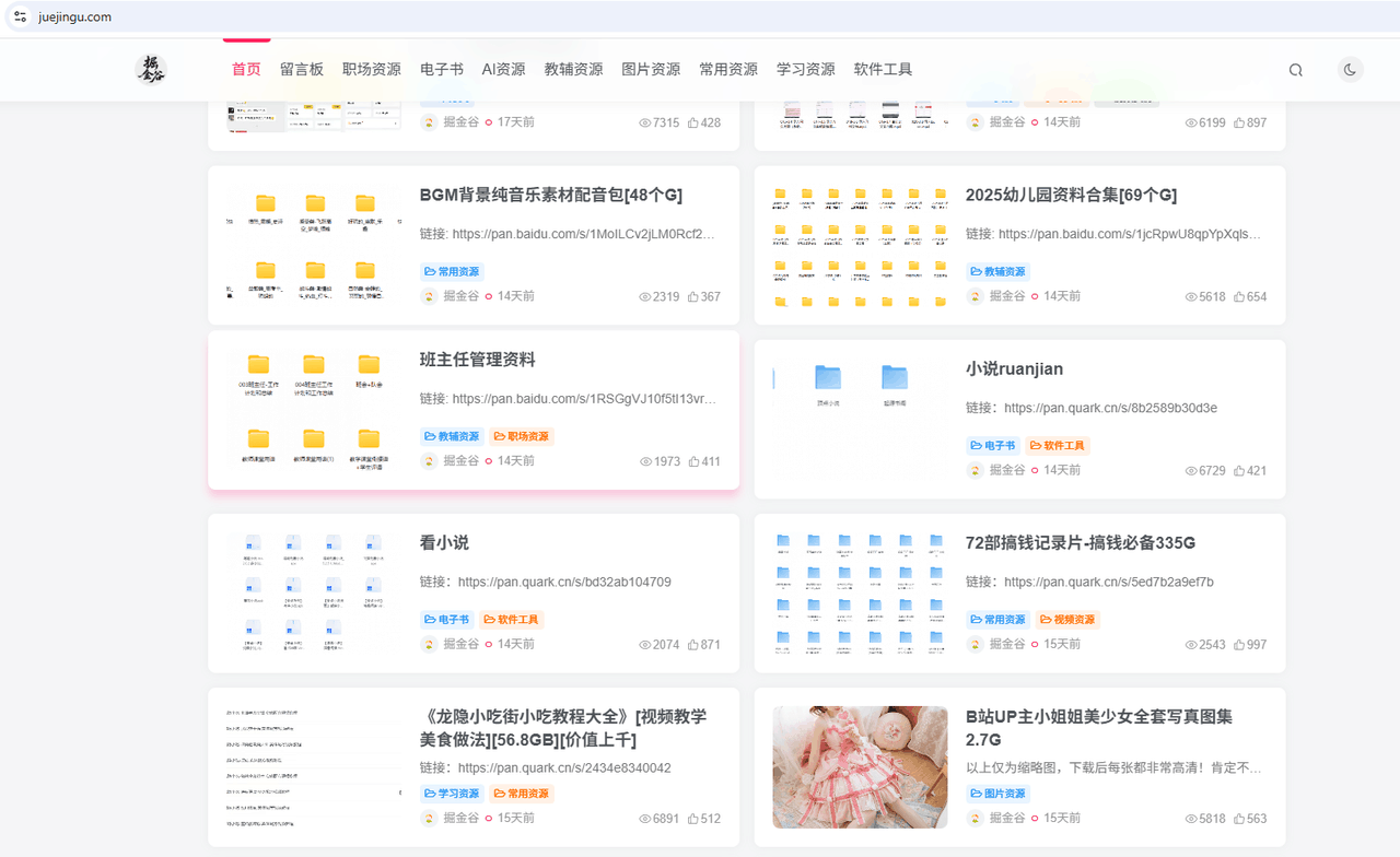 七、掘金谷这个网站,简直是“万能小卖部”,啥都有:影视、壁纸、自媒体软件工具、小吃配方、中小学幼教资料、考公考编课程,甚至还有车载U盘和短剧素材……市面上的资料基本都有,需要什么资料还可以留言,站长会及时更新,重点是,全都能白嫖。