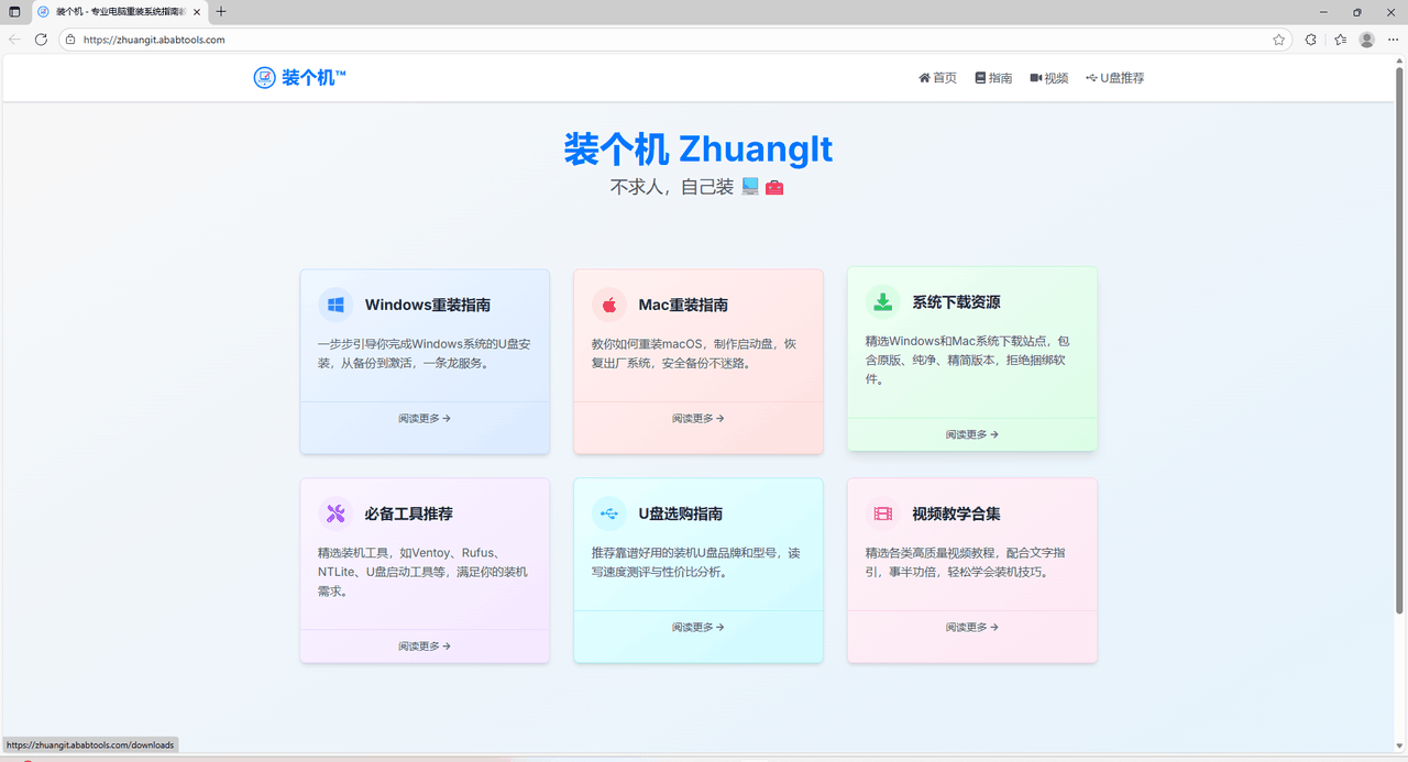 六、装个机这是一个能手把手教你装系统、重装电脑的神奇网站。它整理了 Windows 与 Mac 的详细重装教程,小白跟着学也能轻松搞定,内容包括前期准备、系统安装步骤、激活操作等,全部用通俗易懂的语言讲解,如果看图文不明白,还能点击查看超详细视频教学。