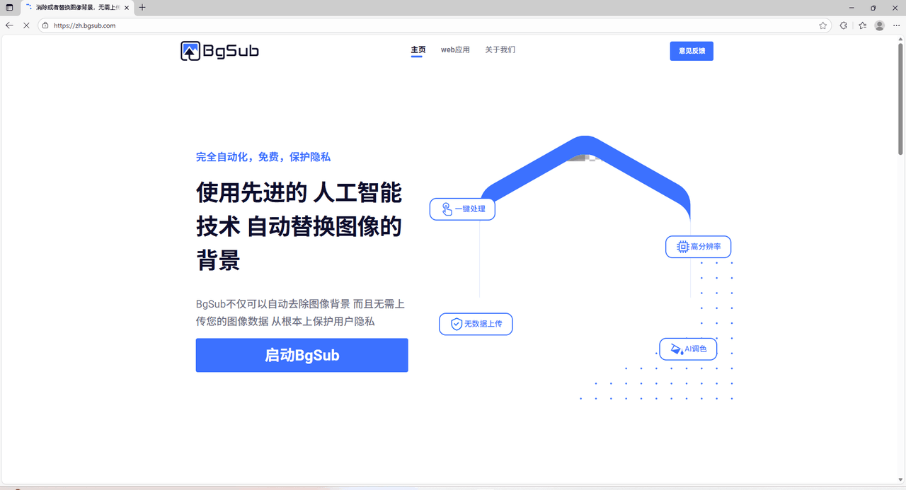 四、BgSub这是一个完全免费的AI图片抠图与换背景网站。只需上传要处理的图片,系统会自动识别并去除背景,你还可以替换颜色、添加图片背景、加滤镜或进行二次编辑,最后点击即可直接保存结果。最关键的是,它完全免费、无需登录。