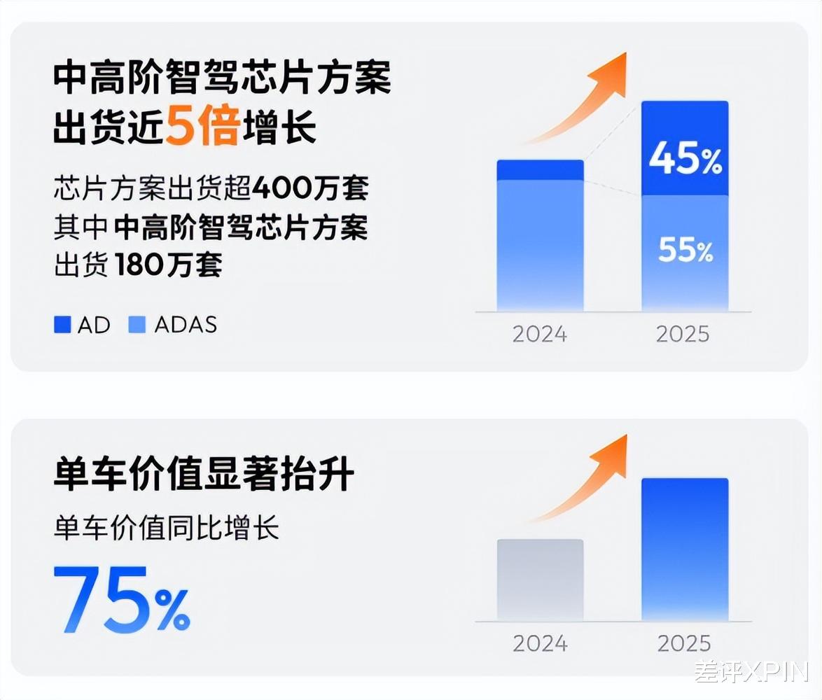 所以我们可以看到,地平线在去年是猛猛出货,总共卖了 400 万套,其中增长最猛的,就是中高阶智驾芯片,达到 180 万套,比前年多了 5 倍。