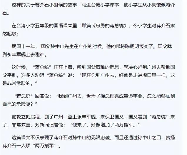 但是,这则故事被写入台湾小学课本,意图就很明显了,明显是想在台湾新一代的孩子们心中,树立起蒋介石的高大形象。