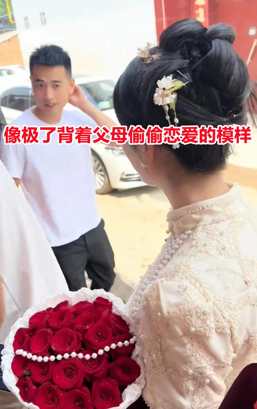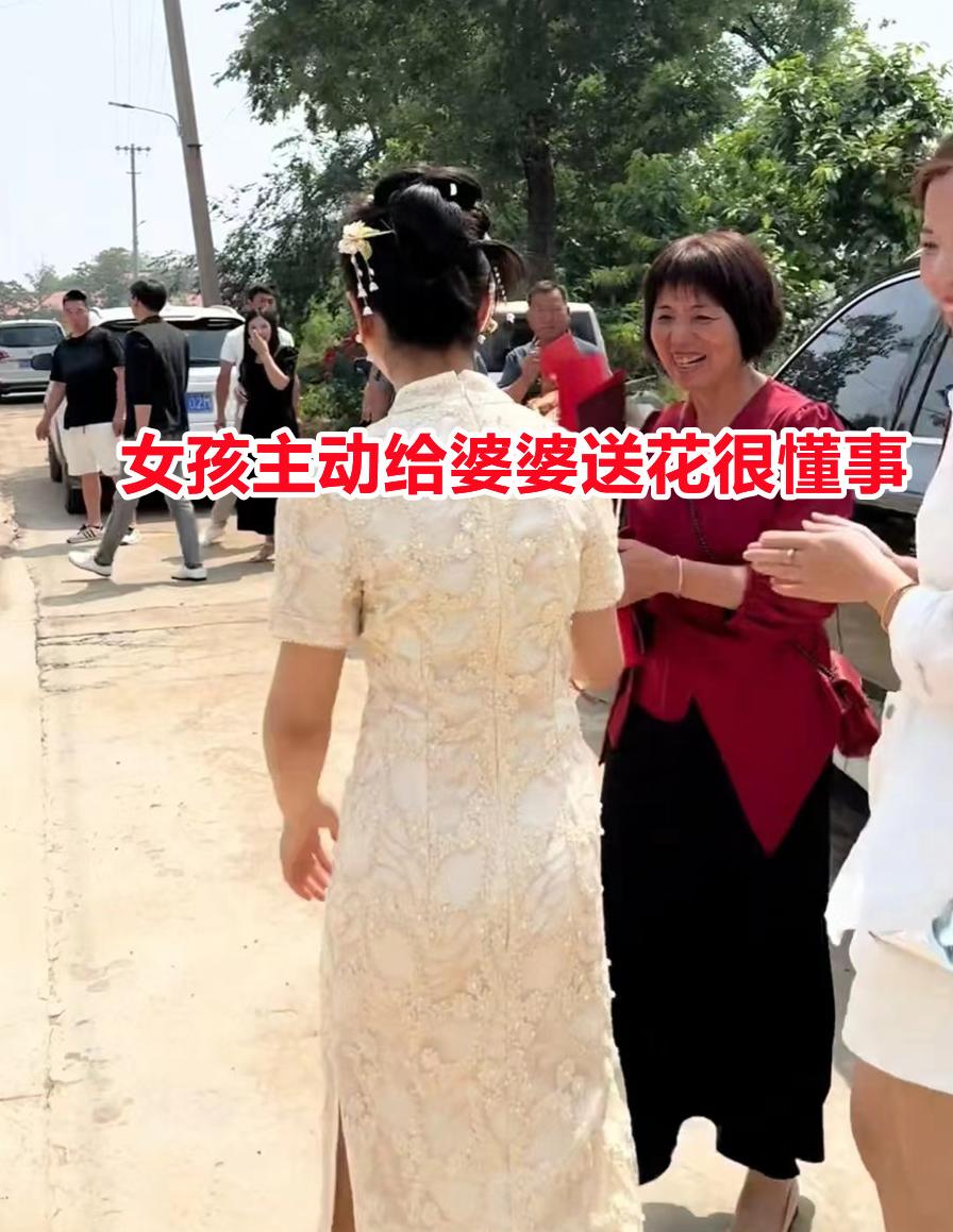 给丈母娘送完花后,小伙子马上转身将另一束花递给了女孩。
