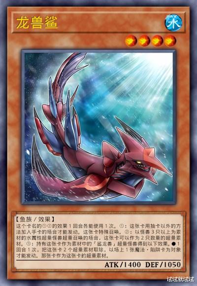 龙兽鲨,被抽卡以外其他方式加入手牌时可以发动效果特殊召唤自己并且在承担3只以上超量素材怪兽时可以充当两个素材,并且以该怪兽为素材的超量怪兽还会获得吃场上魔陷的效果。