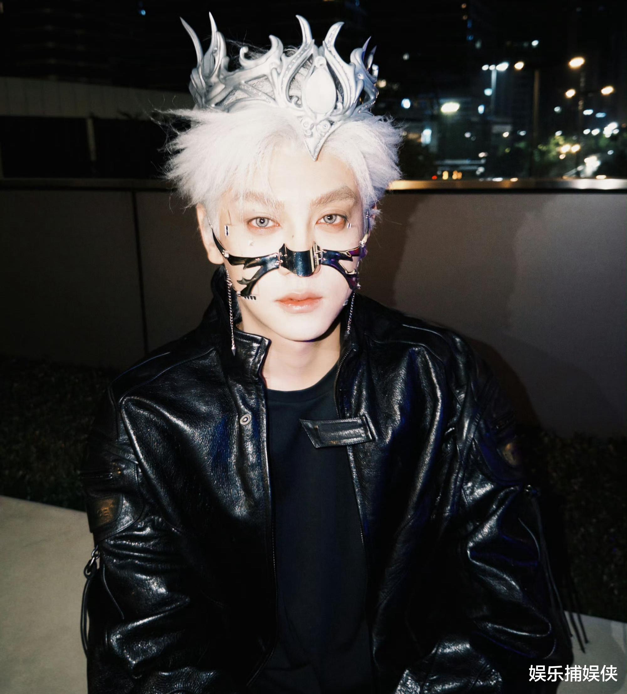 从曝光的图片来看,田栩宁的白发造型真的太有冲击力了。那白发不是普通的白,是一种自带高光的银白色,仿佛每一根发丝都在闪闪发光,仿佛他头顶有一颗小太阳。配上那酷炫的皮衣和脸链,再戴上一顶霸气的王冠,整个人的气场瞬间拉满。有网友调侃说:“田栩宁这是要进军时尚圈,直接把模特们都给比下去了!”还有人调侃:“这造型要是走在街上,估计连路人都要给他让路,生怕自己挡了他的‘神’路。”