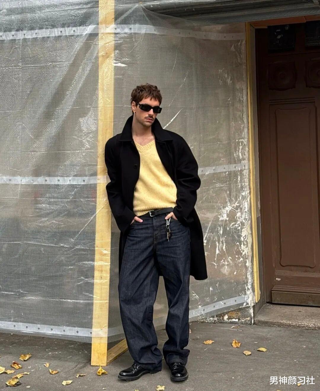 基础款大衣的魅力在于其无限的内搭可能。Jonathan 很喜欢在内搭上做文章,用色彩提亮整体。比如,他会用一件饱和度适中的黄色毛衣来搭配黑色大衣。