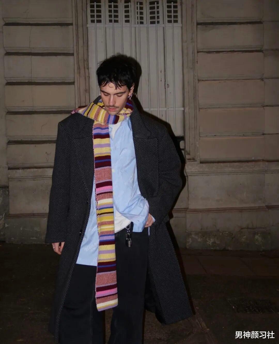即便是基础色穿搭,Jonathan 也要追求完美。在穿大衣时,他的全身可能已经是蓝、白、黑的经典配色。然而,他会在脖子上系上一条彩色围巾,围巾的跳跃色彩瞬间激活了沉稳的蓝白黑,成为全身的点睛之笔。