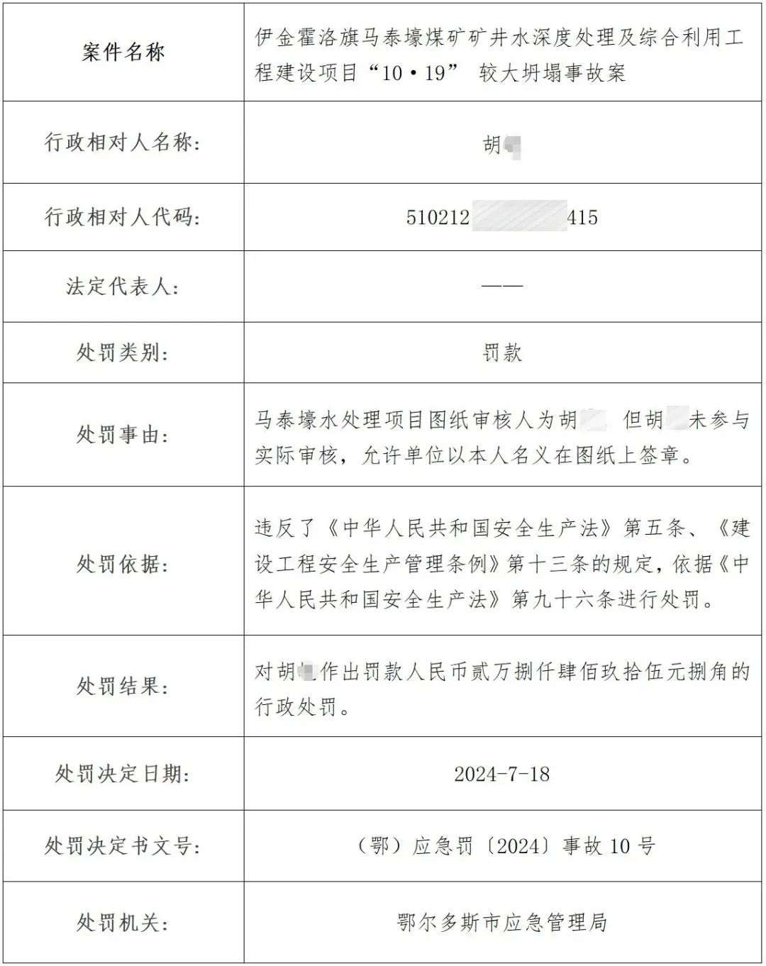 2024年7月,鄂尔多斯市应急管理局发布了一系列处罚公告,其中中*集团杭州研究院有限公司被罚款150万元,图纸审核人胡*被罚款28495.8元。