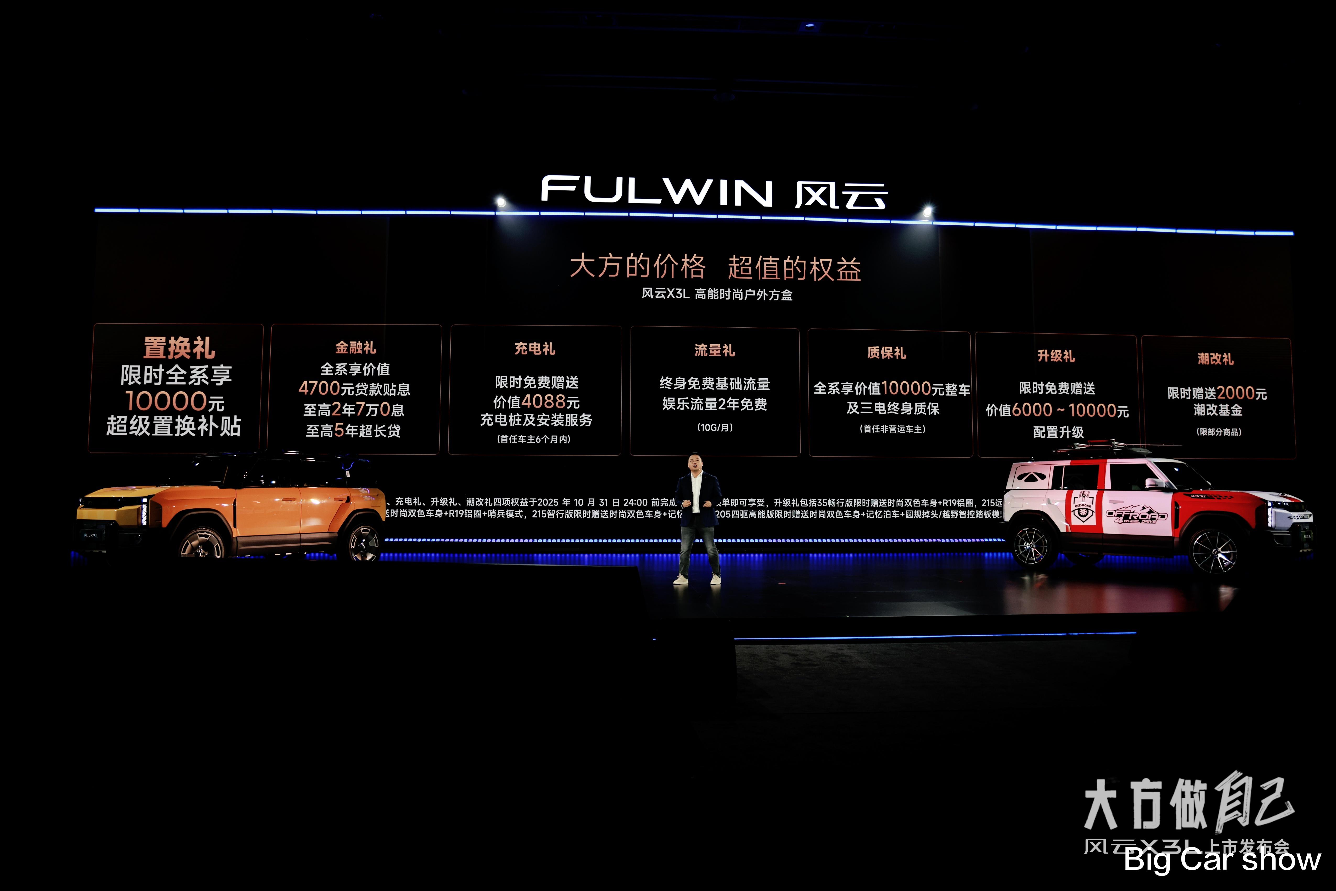 聪明的奇瑞显然读懂了这份遗憾。他们没有放弃硬派方盒子的好底子,反而精准抓住了“空间”和“续航”这两个痛点,于是风云X3L来了。9月17日,风云X3L正式上市,官方价格区间为11.99-15.99万元,置换价10.99-14.99万元。这款新车,像是专门为圆男孩们的方盒子梦而生,当然“不留遗憾”也是奇瑞人的执念。