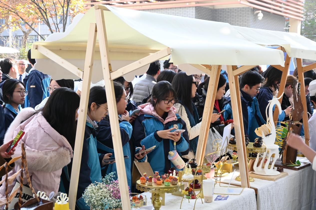 活动现场人头攒动、热闹非凡,各色中西面点展台整齐排列,香气扑鼻的美食引得往来嘉宾驻足流连。展台之上,中式面点区的梅花酥、菊花酥造型精巧,色泽诱人;西式甜点区的慕斯蛋糕、碱水面包颜值与口感兼具,每一款美食都尽显专业水准与匠心巧思。舞台区域,学生们轮番登台献唱,悠扬的歌声与现场的美食香气相互交融,为这场盛会增添了浓浓的青春气息,引得台下嘉宾不时拍手叫好,现场氛围持续升温。