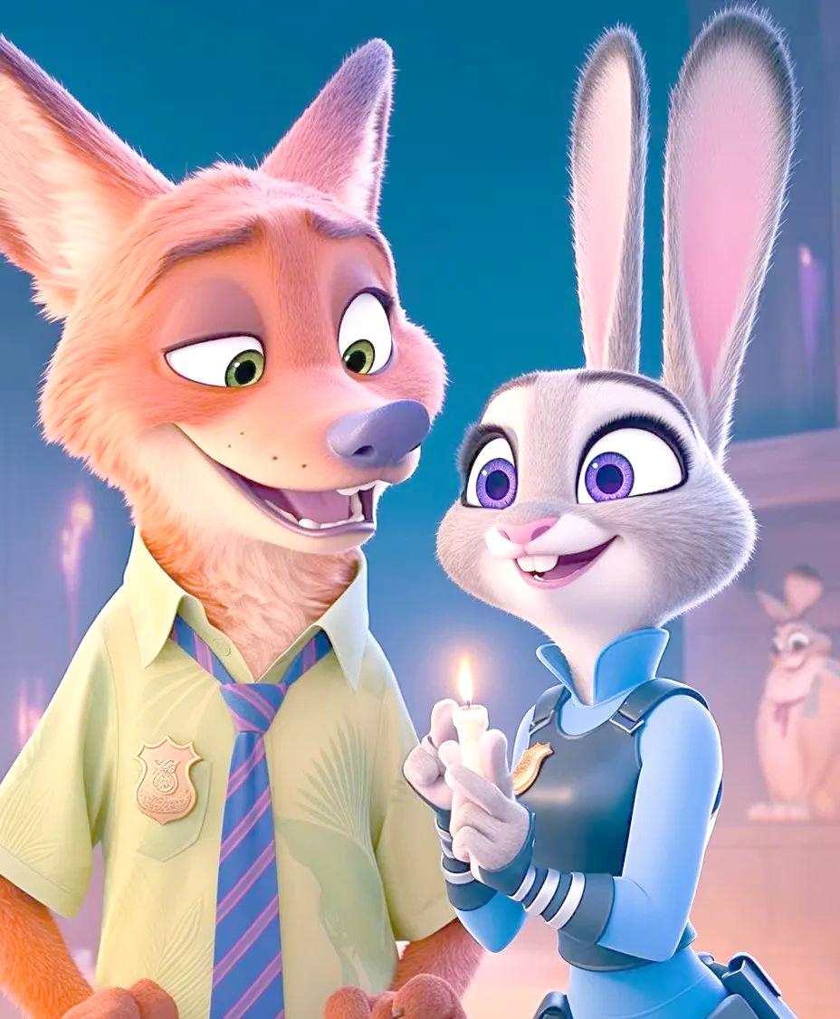 尼克陪着朱迪在第一部中克服了所有艰难险阻,他们之间也有过矛盾,但都相互扶持着走了下去,与单纯的王子救公主或者公主救王子不同,这只狐狸陪着自己的公主走完了全程。