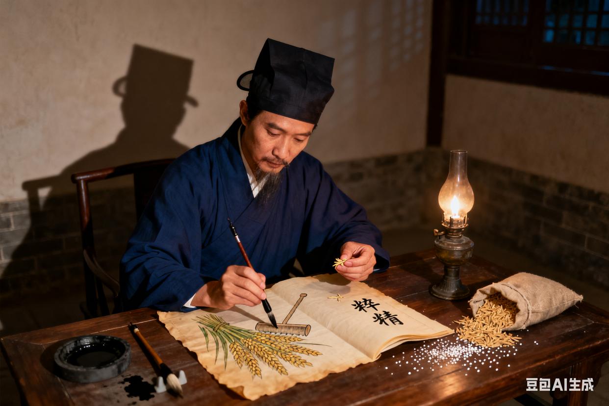 崇祯十年的秋夜,分宜县衙的教谕署里,一盏油灯把宋应星的影子拉得很长。他握着狼毫笔,笔尖悬在稿纸上,纸上已经画了半幅稻子脱粒的图——穗子垂得饱满,农夫手里的连枷举在半空,旁边注着“粹精”二字。桌角放着一小袋新收的稻谷,壳还带着泥土的潮气,他时不时捏起一粒,在指间搓开,稻壳簌簌落在稿纸上,像撒了把细沙。