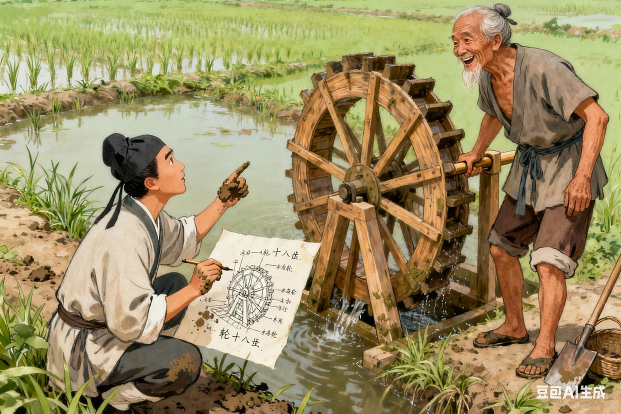 回到家乡奉新后,他就开始走村串户。看到老农用水车灌田,他蹲在田埂上看了半天,问老农:“这水车的齿轮,为什么要做十八齿?”老农笑他:“宋相公,你这读书人,问这个做什么?十八齿转得匀,水来得稳,多一齿少一齿都不行。”他掏出纸笔,当场画下水车的样子,把“十八齿”三个字写在旁边,指尖沾了泥也没在意。