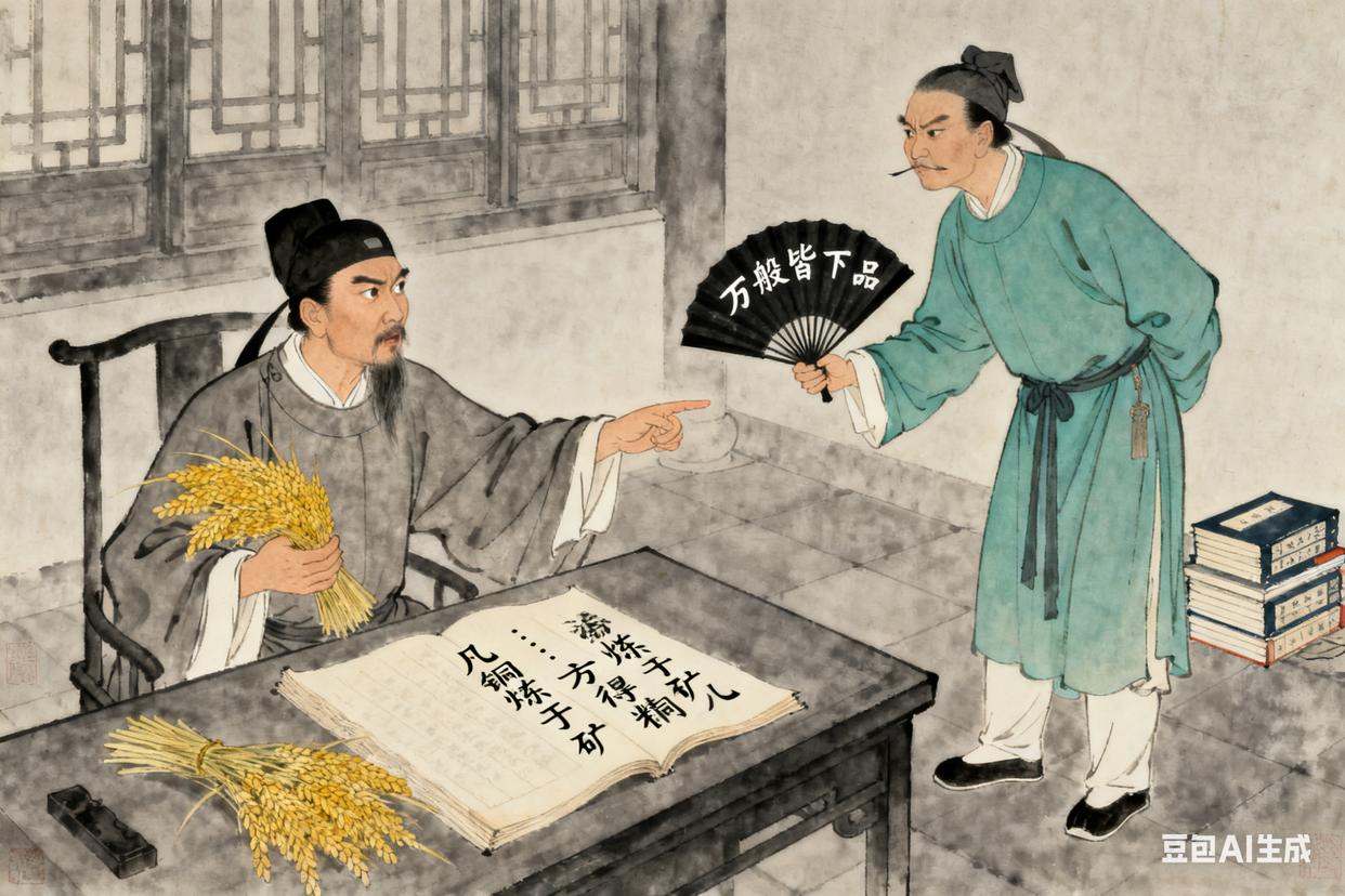 教谕署里的同事王秀才,总笑他不务正业:“应星兄,你好歹是个举人,不去琢磨复考,整天跟农夫、工匠混在一起,传出去让人笑话。”宋应星正在整理冶铜的手稿,闻言抬起头,指着手稿上的句子:“你看,‘凡铜炼于矿,先得矿砂,次淘去土,次炼去石,次化去杂,方得精铜’。这每一步,都关系着百姓用的锅、农具,哪件不比八股文实在?”