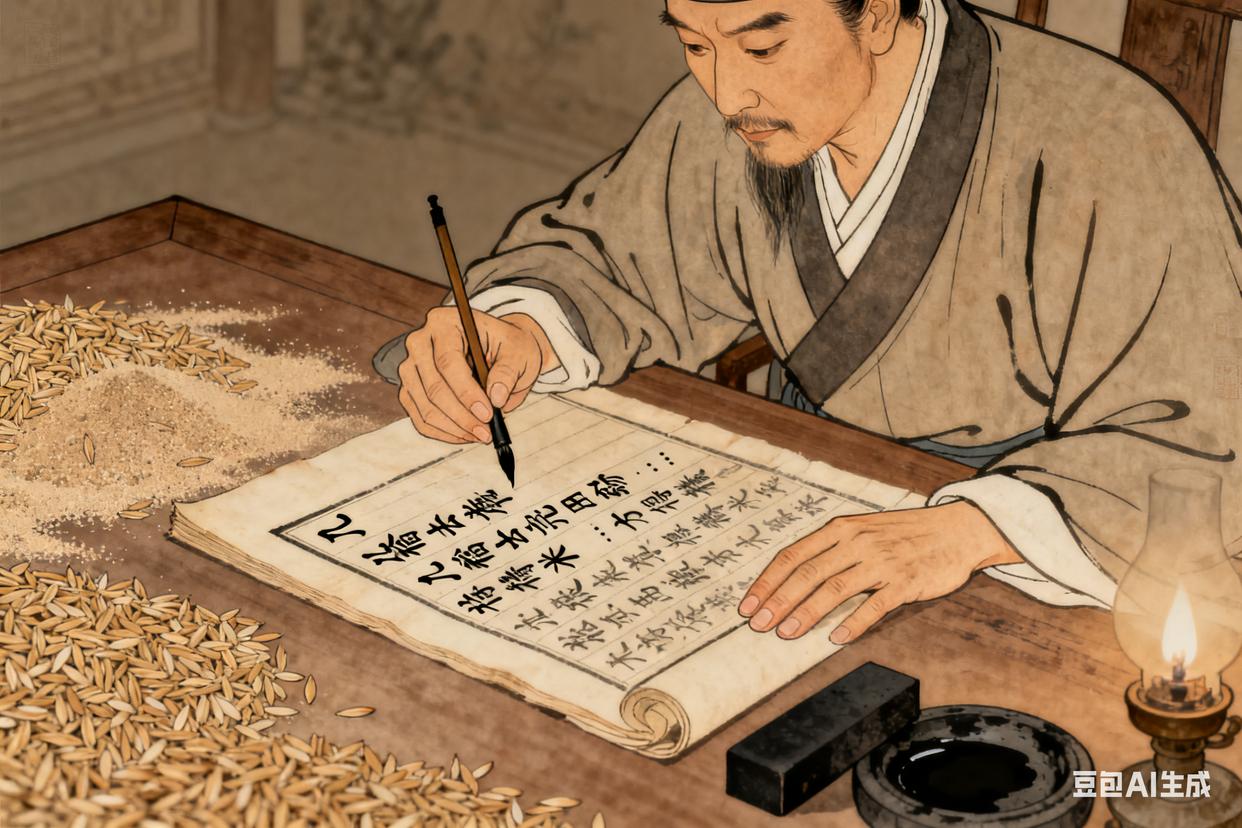 “火候差一分,米就糙一分。”他对着稿子小声说,笔尖蘸了蘸墨,把连枷旁的小字改得更清楚:“凡稻去壳用砻,去膜用舂,去糠用筛,分级用簸,四者递相为用,方得精米。”墨汁干得快,在纸上留下深黑的痕迹,那是他用本地的松烟墨调的,比京城里的墨淡些,却更耐存。