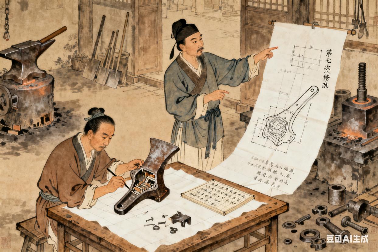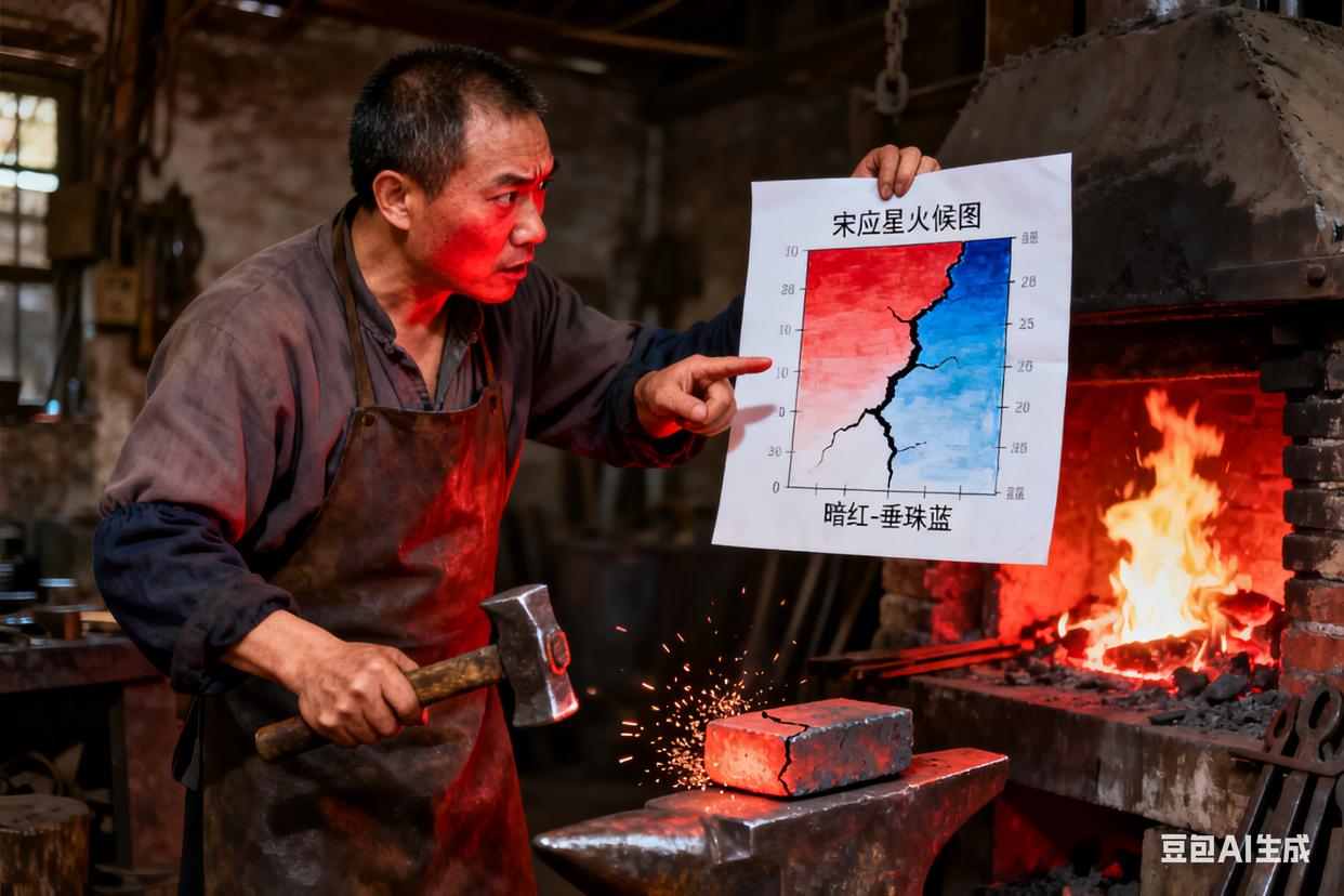 宋应星没争辩,第二天带了块自己观察记录的火候图来,图上画着不同温度下铁的颜色变化,从“暗红”到“垂珠蓝”,标得清清楚楚。他跟铁匠一起烧火,等铁坯变成图上的蓝色,再让铁匠打——这次铁坯没裂,打得又薄又匀。铁匠摸着铁坯,服了:“宋相公,你这图,比我师傅教的还细。”他当时没说话,只是把图上的注脚改得更详细,心里想:“这些本事,比八股文有用多了。”