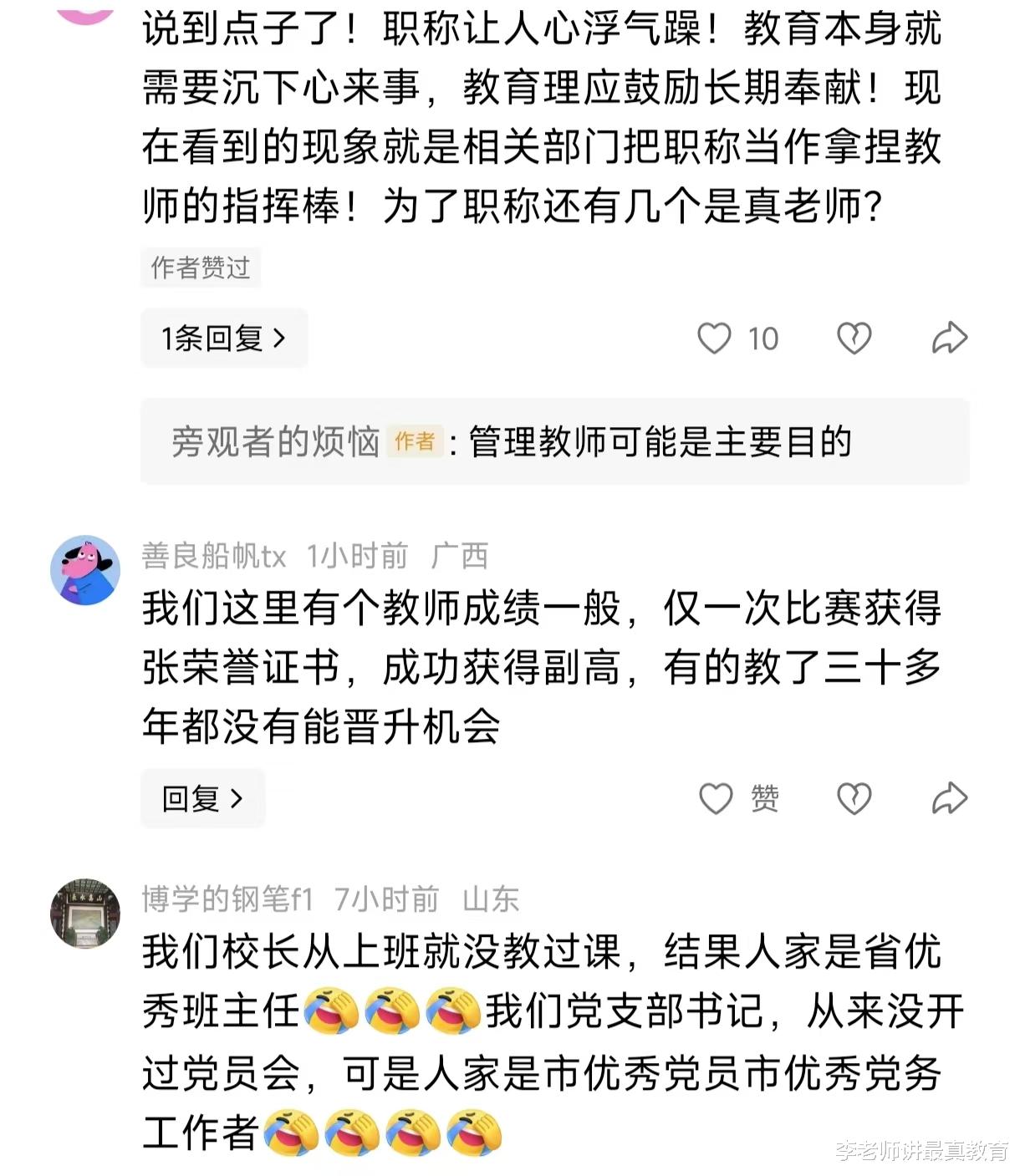 近日一位网友发文质疑:中小学教师职称最不公平的地方就是:一个教师辛辛苦苦在教学岗位上工作一年,或者几年比不上一张优秀证书、一个骨干教师的称号,一堆杂七杂八的荣誉、一篇拼凑的论文.......,这是对普通一线教师日复一日兢兢业业工作的一种侮辱。