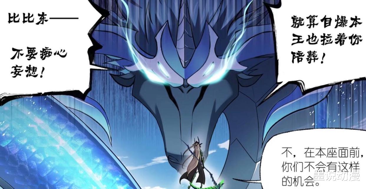 作为森林霸主,天青牛蟒不会妥协,不会交出魂环、魂骨。天青牛蟒早有打算,就算是自爆也要拉着比比东陪葬。如果天青牛蟒能够自爆成功,那至少会给比比东造成重创。可是比比东又如何会给它机会,在它行动之前,比比东又有计划。