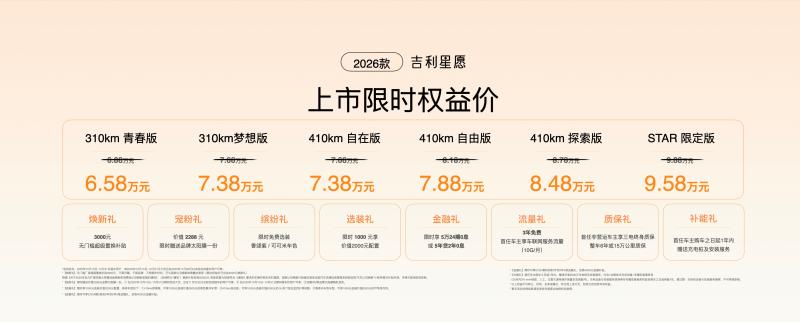 25款车型上市后时隔一年的时间,吉利星愿再次迎来产品力进阶。此次改款在延续经典设计理念的同时,进一步强化了配置方面的竞争力。2026款吉利星愿上市限时权益价为6.58万元–9.58万元,推出了六款车型,同步推出八重限时购车权益,进一步降低购车门槛。