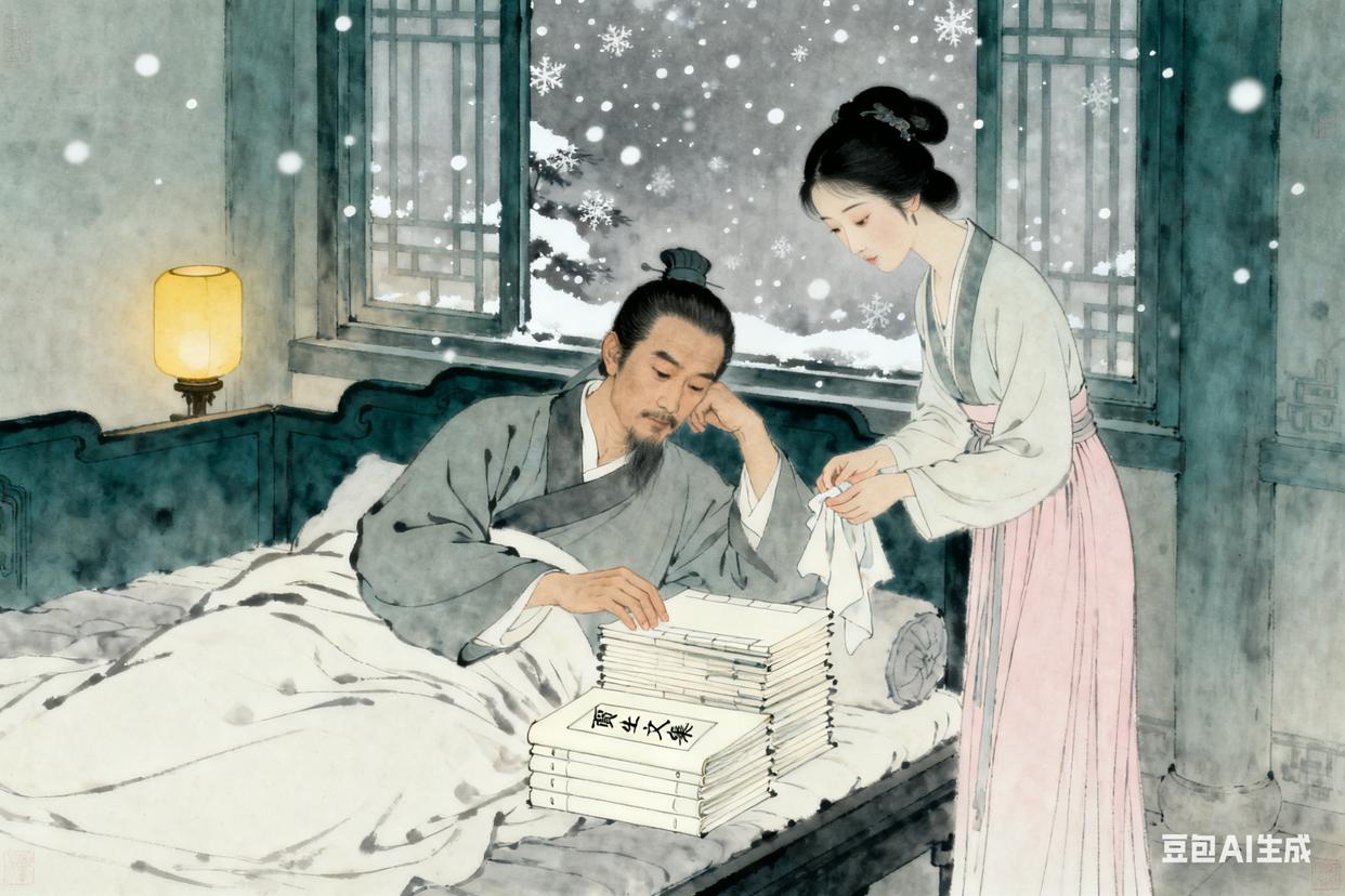 从那以后,贾谊的身体就越来越差。他常常坐在书房里,看着窗外的树发呆,有时候一整天都不说一句话。家人劝他多休息,他却摇着头,继续整理自己的文稿,把之前写的奏疏、赋文都装订好,叮嘱妻子:“这些东西,你一定要好好收着,将来要是有机会,交给可靠的人,或许能对国家有用。”文帝十二年的冬天,贾谊躺在病床上,已经快说不出话了。他看着窗外飘落的雪花,对妻子说:“吾恨不能见汉定天下,然吾之策,终有一日会用之。”说完这句话,他就闭上了眼睛,年仅三十三岁。