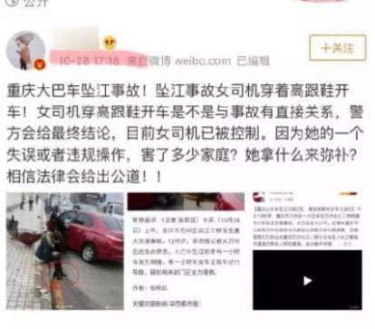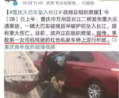 事故发生后,救援力量迅速集结,70多艘救援船只、专业打捞船和大型浮吊赶赴现场,展开24小时不间断搜救,与此同时,一场舆论风暴正在酝酿。11点15分,第一家媒体在微博发布公交坠江消息,随后,越来越多媒体加入报道行列,有媒体称从“万州区应急办”获得消息,断言是“小轿车女车主驾车逆行导致”。紧接着,更多媒体跟进,“女司机逆行”、“穿高跟鞋”等细节被大量渲染。比如“疑似女司机坐在路边,脚穿高跟鞋”,“重庆公交车坠江原因:女司机逆行!”,“私家车女车主邝某已被警方控制”等等等等,“疑似”这样的字眼竟也成了新闻。