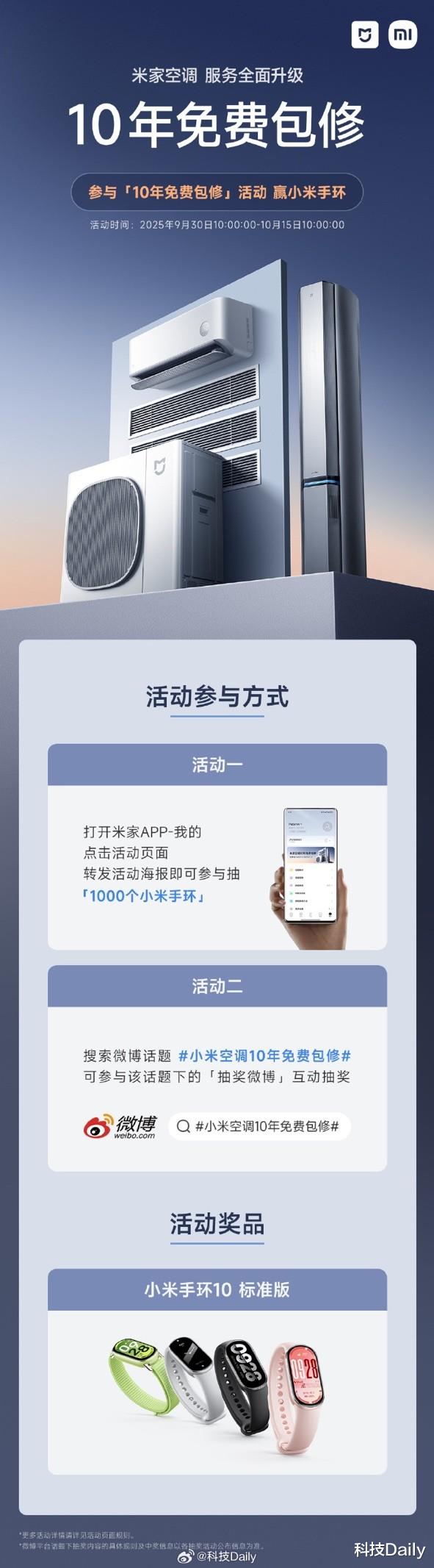 只要是在2025年1月1日起完成首次安装的米家空调,不管是米家空调柜机、米家空调挂机,还是米家中央空调,都可以升级10年免费包修(以前是6年现在升级为了10年),相当于为自己家的空调免费升级了一张包修卡。