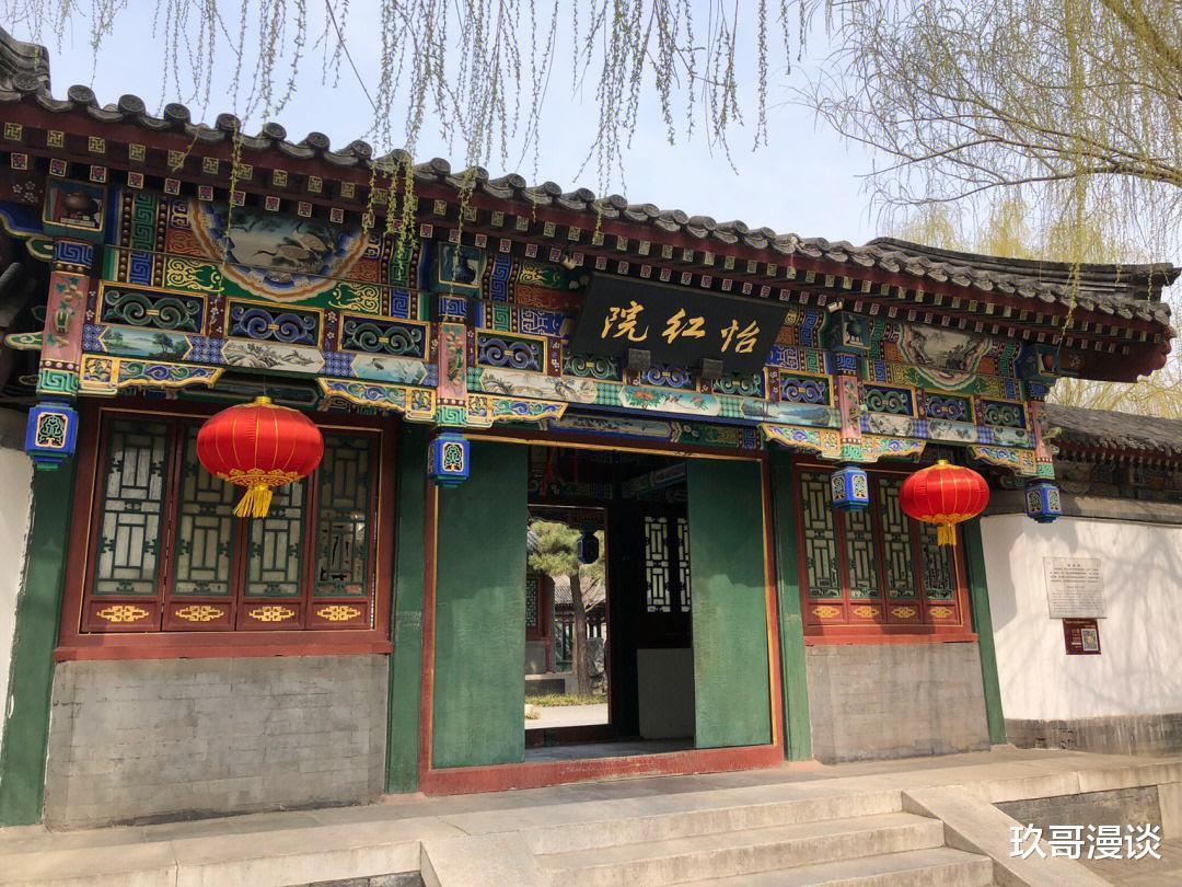 怡红院位于大观园西南端,是以《红楼梦》原著中贾宝玉的居所为建筑蓝本,这个院落是大观园内最为豪华、最为富丽堂皇的一个地方。院中两侧分列芭蕉、海棠,小桥在外侧,三开间的垂花门楼,四面是抄手游廊、五间正座、三间抱厦、东西各有配房三间,正房上有题额“怡红快绿”,是元妃省亲时根据宝玉所题的"红香绿玉"改写的,暗示着门前的西府海棠和几本芭蕉。怡红院是宝玉与园内众姐妹活动的一个主要场所,晴雯撕扇、平儿理妆、病补雀裘、寿怡红群芳开夜宴、刘姥姥醉卧怡红院等一系列重要的故事都在这个地方发生。