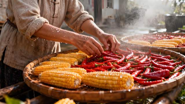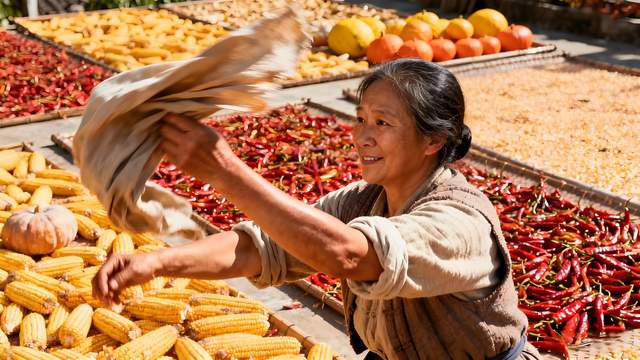 晒秋更是一场斑斓的色彩盛宴与情感的仪式升华。火红辣椒寓意 “红火兴旺”,金黄玉米象征 “金玉满堂”,橙红柿子代表 “事事如意”,村民们将这些承载美好祈愿的作物铺进竹编晒匾,拼出 “福”“丰” 等吉祥图案,既是对天地化育的敬畏与感恩,也凝聚着丰收的喜悦。竹编晒匾形如满月,竹竿撑架意喻 “竹报平安”,每一件器物之中都暗藏深厚的文化密码。来自北京的文化学者李先生驻足观赏许久后赞叹:“屋顶作画布,五谷当颜料,这不仅是农事,更是最生动的乡土美学。”