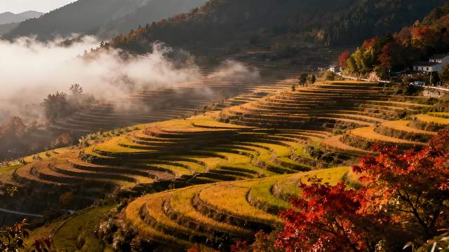 梯田雾散枫初渡,古巷茶香绕梁柱。
