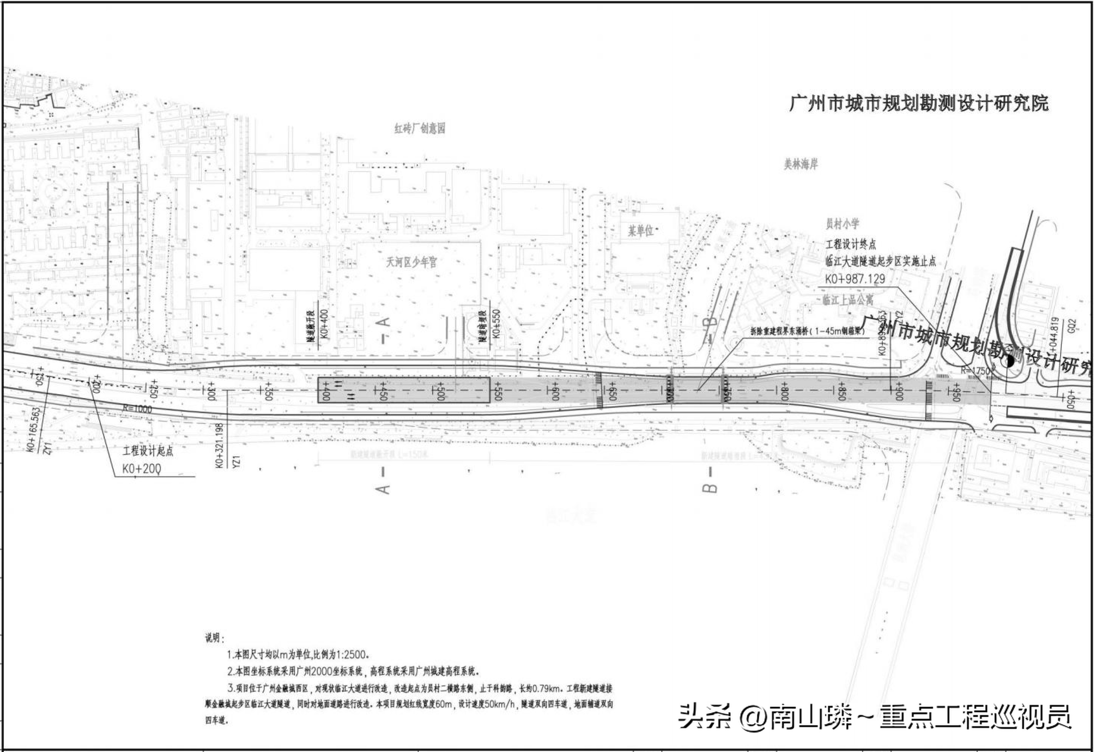 临江大道隧道金融城西区段项目位于广州市天河区金融城西区,对现状临江大道进行改造,改造起点为员村二横路东侧,止于科韵路,长约790m,临江大道为主干道。
