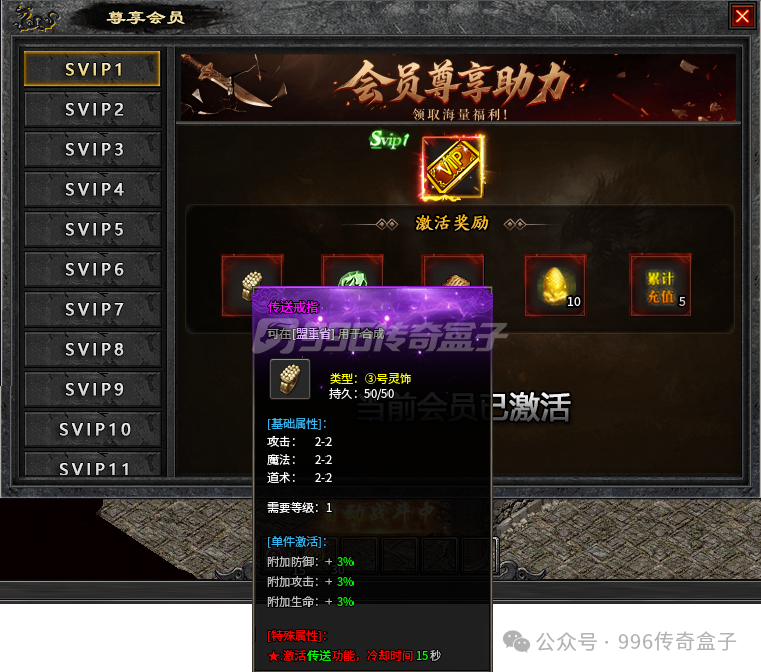 开始是有引导的,跟着引导下图刷怪就好,快速领取VIP1,会送一个传送戒指,有了这个后续抢怪会方便!每个图都有好几层,层数越往后,BOSS等级越高,爆率越高,爆的装备也越好。