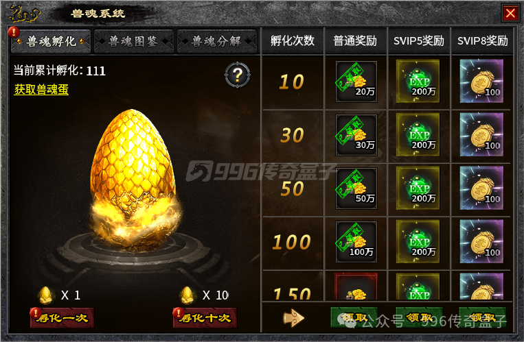 兽魂系统是这个服的重要玩法之一,刷怪或者完成任务都会获得兽魂蛋,孵化可随机获得兽魂。兽魂分为五个等级,红色是最高级的,级别越高的兽魂属性越强。孵化后可在背包中选择属性最强的兽魂佩戴,其余兽魂收集点亮图鉴即可,多余的兽魂可以分解为兽魂碎片。红色的兽魂不要分解,可以融合兽魂属性,最多可融合五条属性,成功几率10%,十次保底,融合失败副兽魂直接破碎。还是可以试试的,反正主兽魂是不会有变动的。