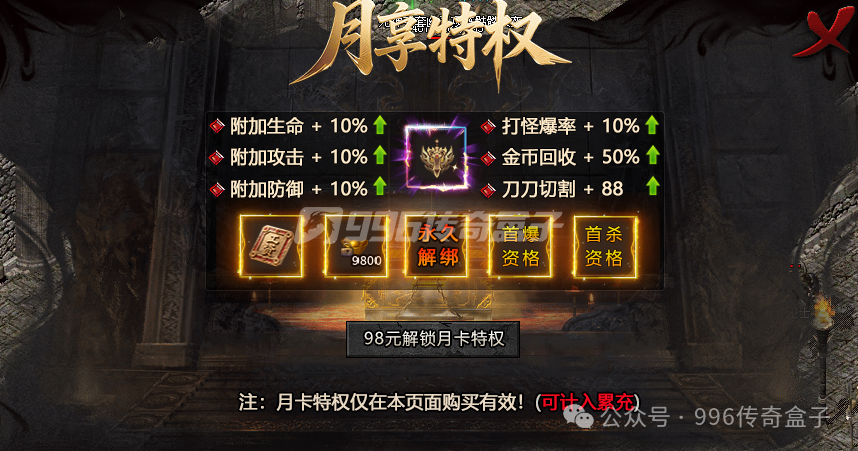 如果只是体验一下,建议零氪,因为散人也有很好的体验,不管是刷怪还是爆率都不错的。如果想长久玩,建议直接开启98月卡特权,这个月卡其实挺划算的,永久解绑,有首爆和首杀资格,还有一个三十天的工资卡,可能月卡的月,是体现在这个工资卡上了。这个月卡是计入累充的,累充是可以白嫖的,刷怪可以激活VIP,赠送累积充值,VIP等级越高,累充给的越高,本命金莲中的猎魔抽奖也能抽到累计充值,累计充值满1200可以领取冠名。