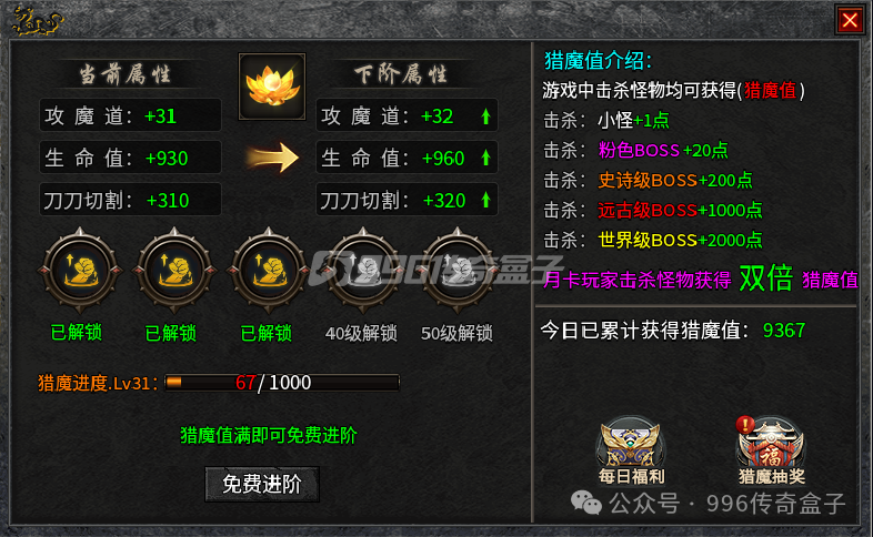 本命金莲要优先升级,加切割,还是免费的。击杀不同的怪可以获得不同的猎魔值,可以进阶猎魔进度,到达一定等级可以解锁金莲属性。猎魔值达到需求还能进行抽奖,抽奖不扣除猎魔值,每次抽奖能获得一点抽奖积分,可以兑换称号。每天可参与两百次抽奖,抽奖次数会在每晚零点重置,抽奖积分不会,可以攒一攒。