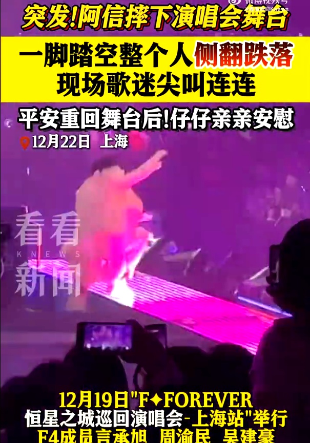 舞台灯光闪烁,音乐震耳欲聋,F3+阿信的“F✦FOREVER恒星之城巡回演唱会”上海站本该是一场完美的演出,却因阿信意外摔下舞台,让全场粉丝的心瞬间揪紧。