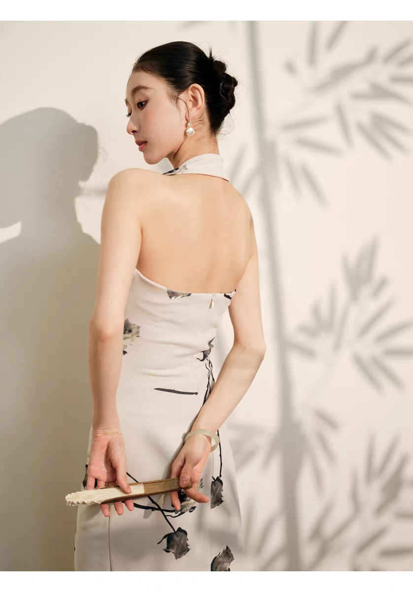 纪安熙白金夫人新中式国风挂脖连衣裙女春季复古印花长款包臀裙